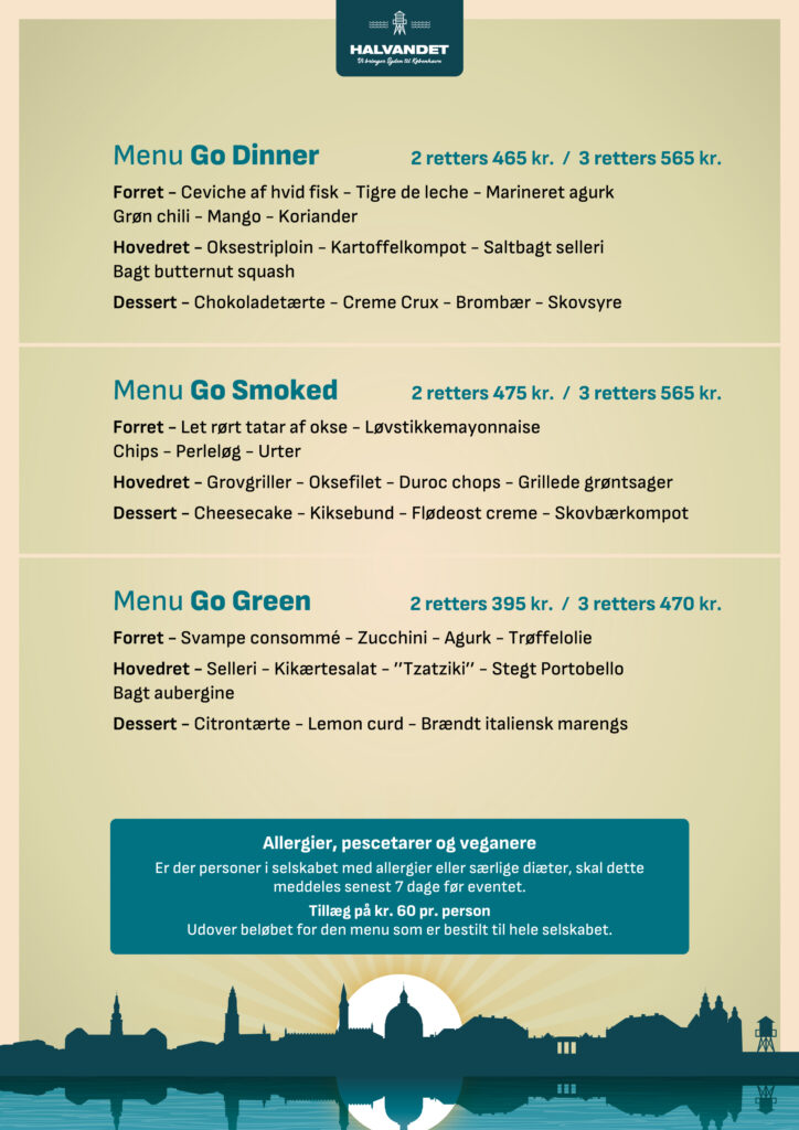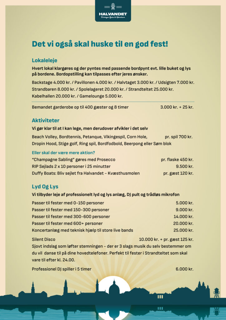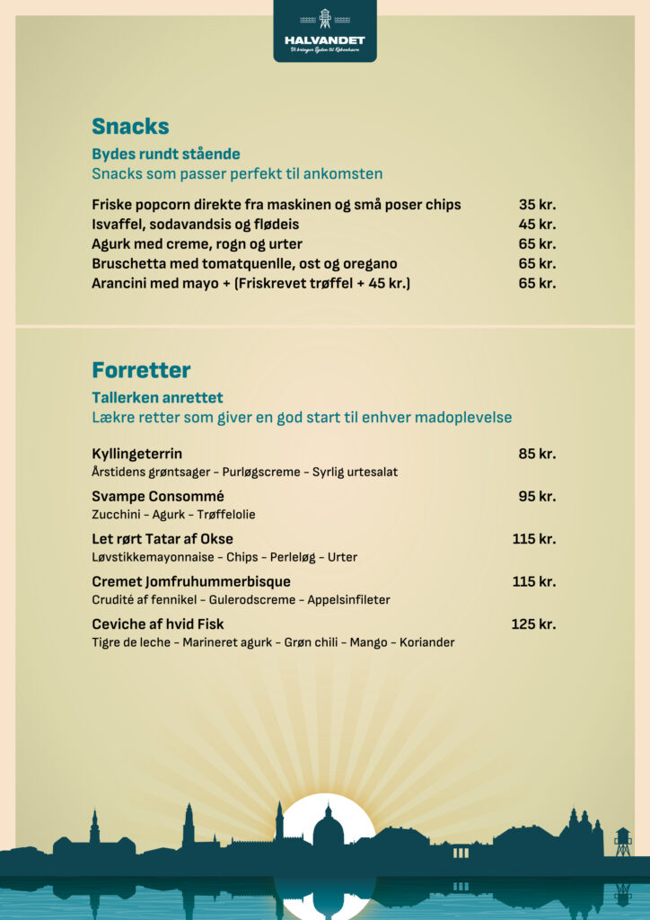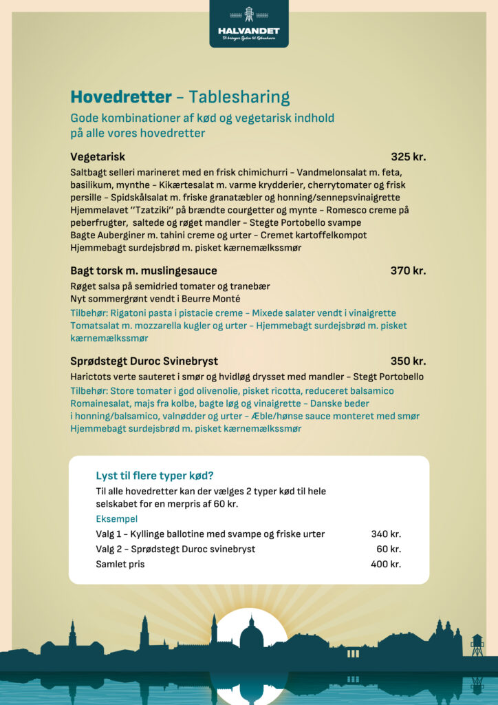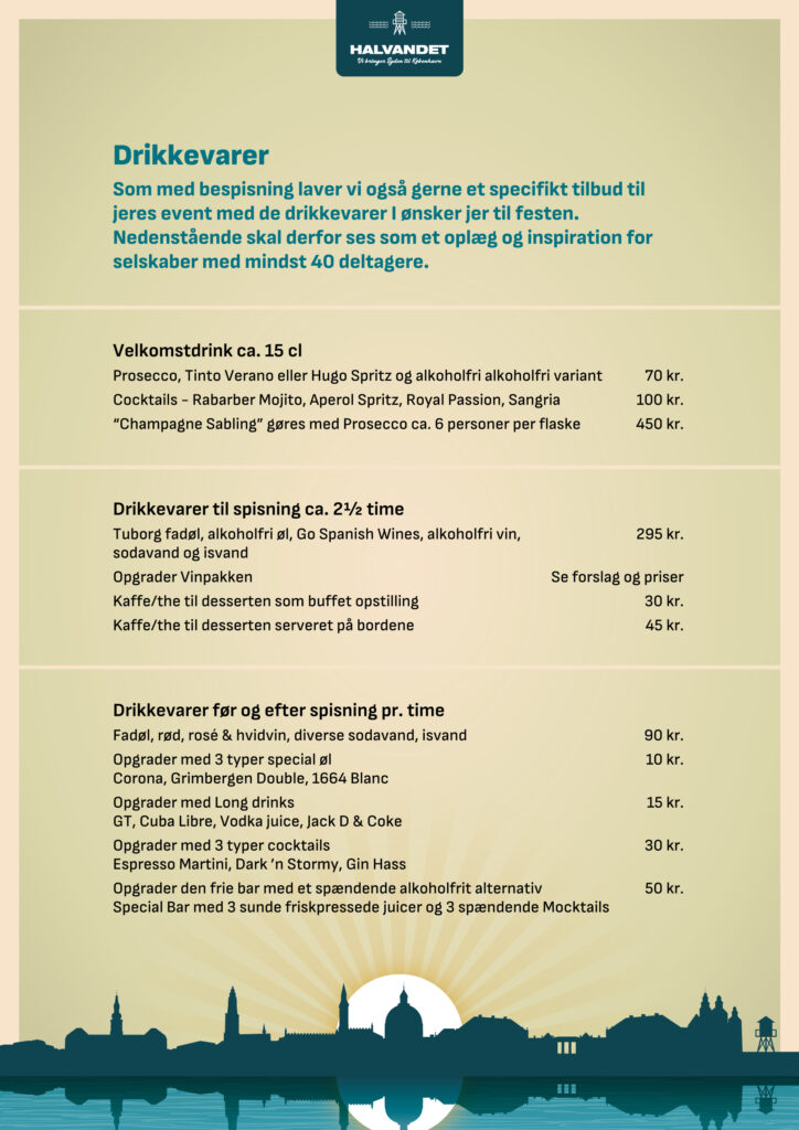 På Halvandet og Kabelhallerne skræddersyr vi gerne jeres event ud fra ønsker og behov. På disse sider finder I menuforslag og øvrige forplejnings muligheder samt relevante ydelser til at sammensætte arrangementer af forskellige karakter.