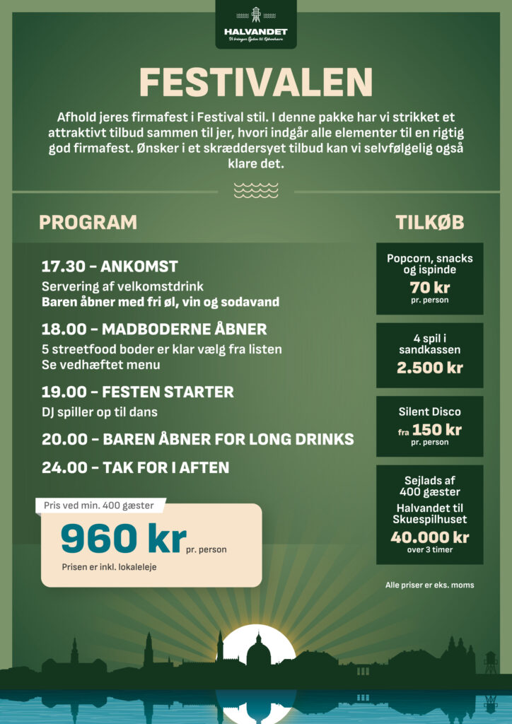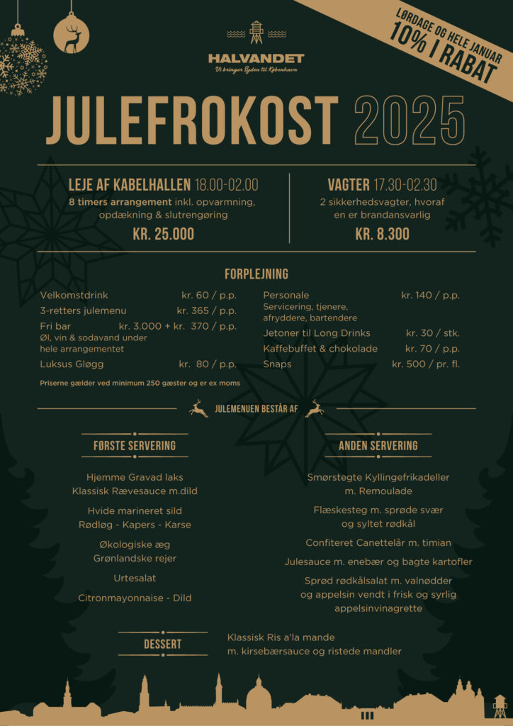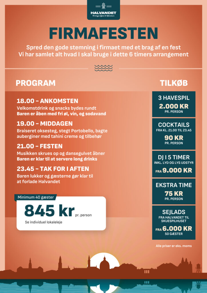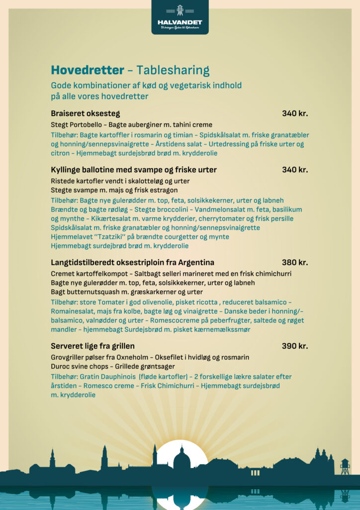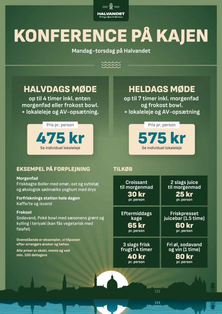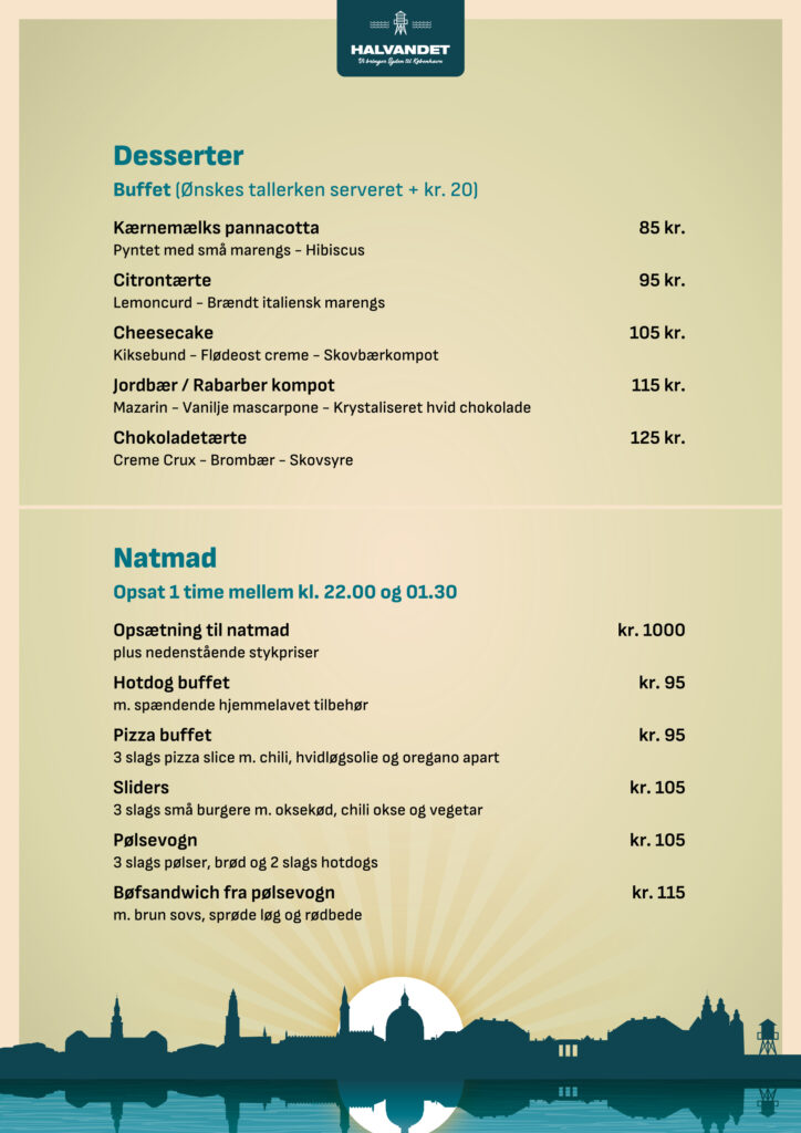På Halvandet og Kabelhallerne skræddersyr vi gerne jeres event ud fra ønsker og behov. På disse sider finder I menuforslag og øvrige forplejnings muligheder samt relevante ydelser til at sammensætte arrangementer af forskellige karakter.
