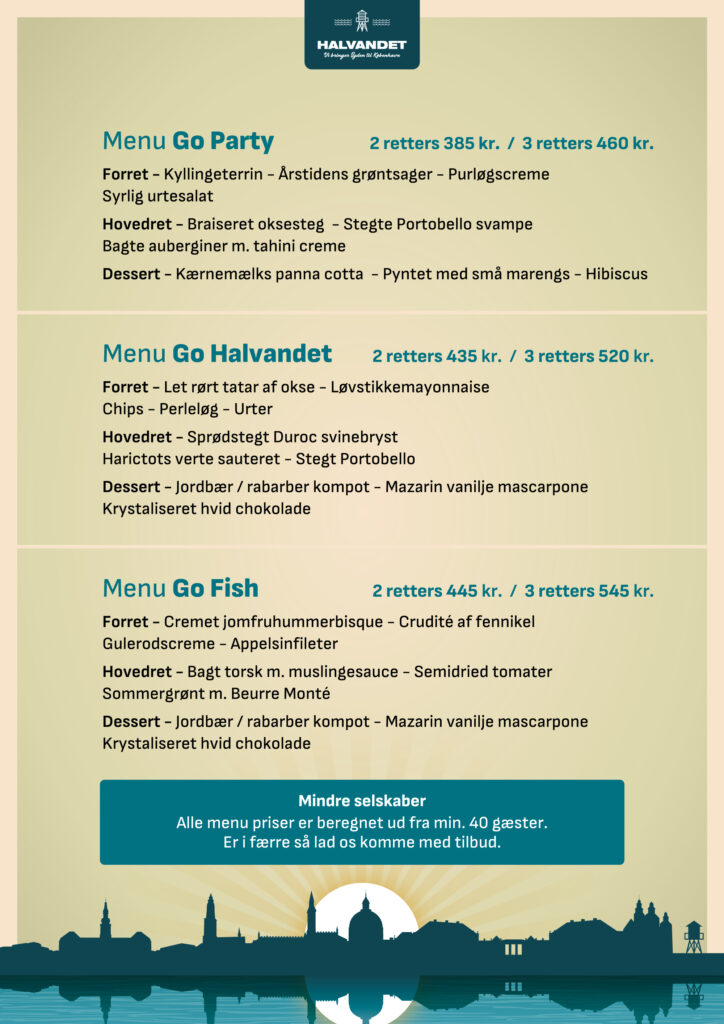 Vores selskabsmenuer er kun lavet til inspiration og vi kan selvfølgelig også tilbyde lige det i kunne ønsker jer. Vær obs på at priserne i Selskabskortet er med udgangspunkt i 40 kuverter. Ved mindre selskaber kommer der et tillæg.